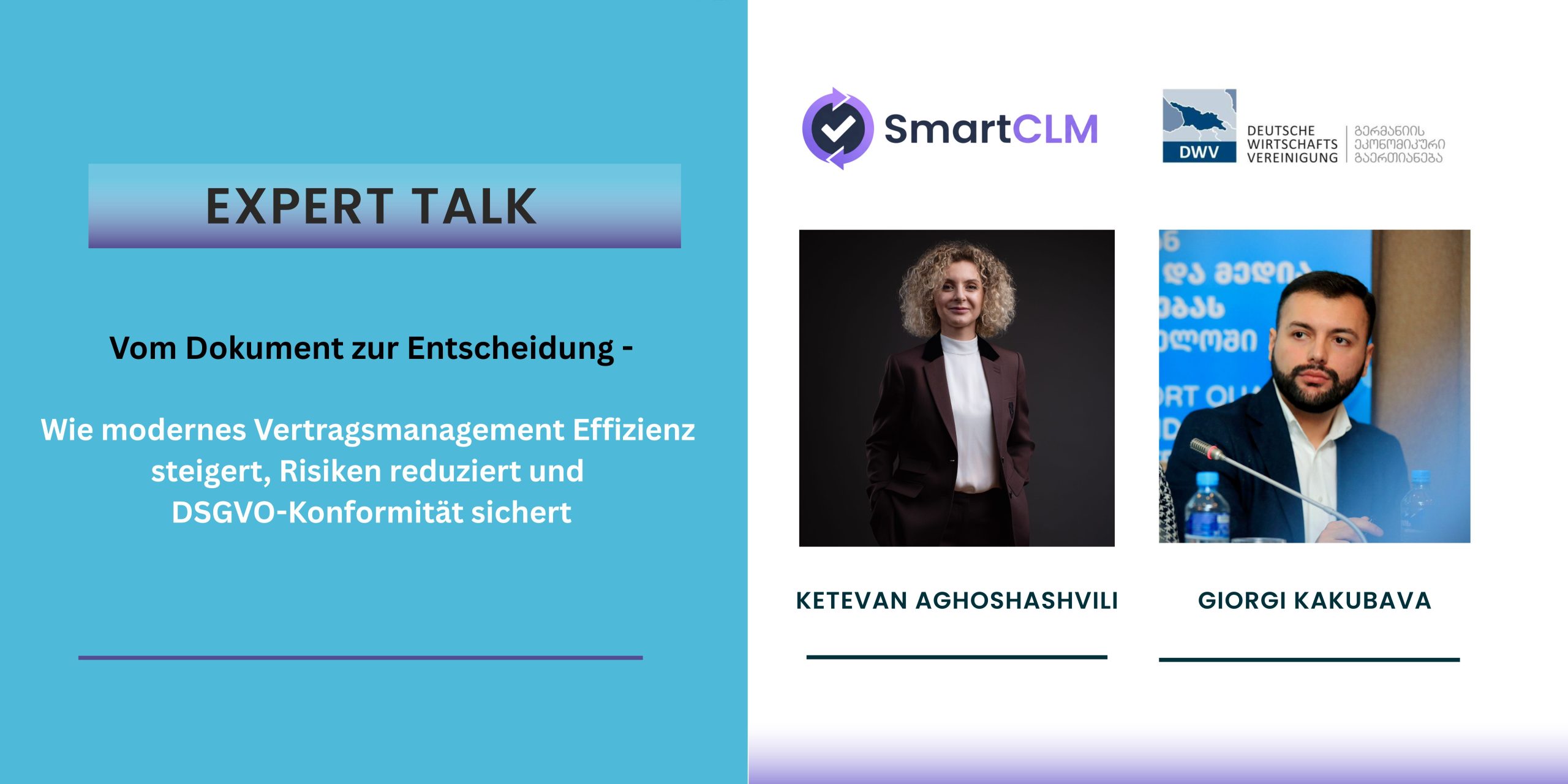 Im Rahmen der Veranstaltung geben Ketevan Agoshashvili, Gründerin von SmartCLM.ai, und Giorgi Kakubava, Rechtsanwalt und Datenschutzexperte, praxisnahe Einblicke in moderne Ansätze des Vertrags- und Dokumentenmanagements.