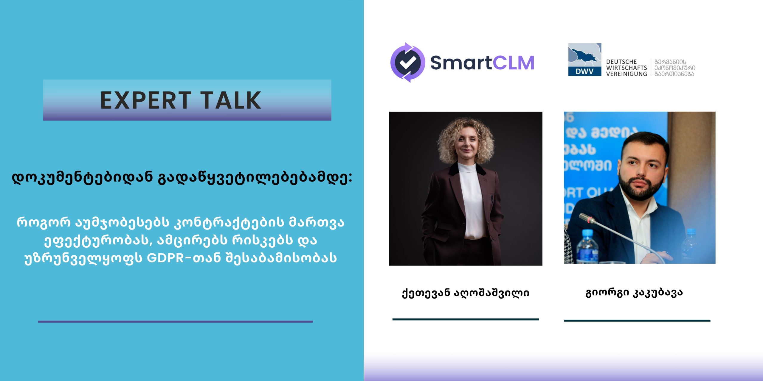 29Apr.11:0013:00Expert Talk: დოკუმენტებიდან გადაწყვეტილებებამდე: როგორ აუმჯობესებს კონტრაქტების მართვა ეფექტურობას, ამცირებს რისკებს და უზრუნველყოფს GDPR-თან შესაბამისობას